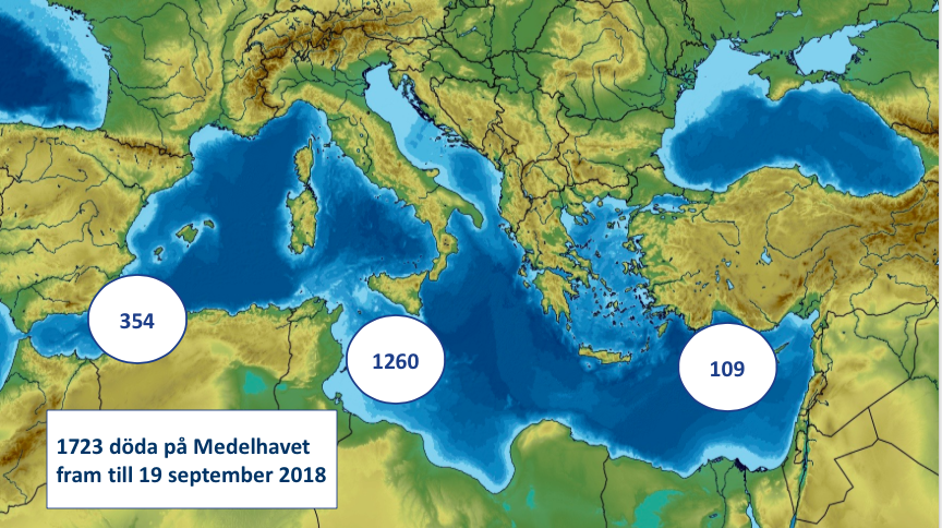 Antalet människor som korsar Medelhavet har minskat med 41 procent jämfört med förra året. Men samtidigt har andelen människor som dör på Medelhavet på vägen till Europa ökat. I mitten av september hade åtminstone 1 723 människor mist sina liv längs Medelhavsrutten, de flesta när de försökt korsa havet från Libyen.2 Det är 1 av 18 som aldrig kommer fram, under samma period förra året var det 1 av 42. Vid landsgränserna beräknas av vad UNHCR vet minst 74 människor ha dött fram till juli 2018, även det en ökning från samma period 2017 då 42 beräknas ha omkommit.3 Men eftersom vi inte ver hur många som ger sig ut på Medelhavet kan mörkertalet vara högt.4