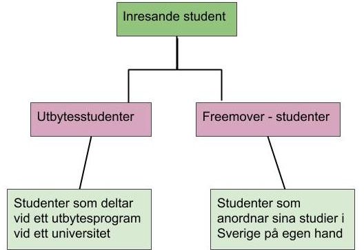 Gruppen inresande studenter bestÄr dels av sÄ kallade freemover-studenter som anordnar sina studier i Sverige pÄ egen hand, dels av utbytesstudenter som deltar i ett utbytesprogram vid svenska universitet och högskolor. Freemover-studenter Àr studenter som beviljats uppehÄllstillstÄnd pÄ grund av studier, utrikes födda som invandrat mindre Àn sex mÄnader innan studiestarten, samt personer som inte har svenskt personnummer eller svenskt medborgarskap. En stor skillnad mellan utbytesstudenter och freemover-studenter Àr att utbytesstudenter oftare studerar en kortare period i Sverige dÄ deras utbytestermin ingÄr i utbildningen i hemlandet. Majoriteten av av de nya inresande utbytesstudenterna kommer inom ramen för ett EU-program.2